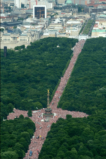 Чуть-чуть собралось 50 участников, и организаторы хотели бы еще подождать, но по-другому думала полиция. Главный полисмен подошел к Маттиасу и спросил, не хочет ли он уйти. После этого были включены генераторы и все двинулись рядом с автомобилями Кудаммом, что в Шарлоттенбурге, в парк Тиргарден. Так начался парад любви. Дорогой участников становилось все больше и больше, музыка гремела по сторонам, полиция не мешала, ведь видела, что участники парада не представляют угрозы. Это была революция и ничего другого.