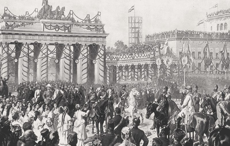 Паризька площа біля Бранденбурзьких воріт представляла в алегоріях перемогу над армією новоствореної Французької республіки та над її столицею Парижем.Трибуни були створені як амфітеатр, на якому зібралися берлінські сановники та натовп із 60 фрейлін у білому, які спостерігали за входом Війська та підбадьорювали вояків. Мер Берліна Генріх Філіп Гедеманн виголосив там промову, щоб привітати імператора. Фрейліна Жанна Блезер, донька Густава Блезера, прочитала короткий вірш, а потім їй дозволили вручити імператору лавровий вінок на білій атласній подушці, яку він із вдячністю прийняв від імені всієї армії. Під час параду групи громадян і підприємців організовувались та підтримували порядок серед глядачів у визначених місцях. Вступ переможної армії супроводжувала похідна музику, дзвони та крики «ура». У Люстгартені парад завершився покладанням захоплених французьких прапорів перед не відкритою на той час кінною статуєю короля Фрідріха Вільгельма III. А вже на церемонії закриття параду, відбулося урочисте відкриття цієї кінної статуї.
