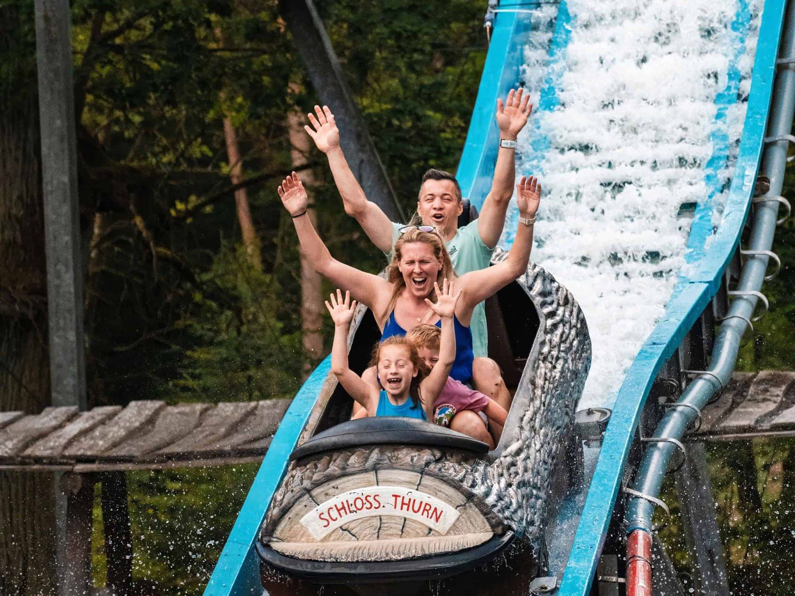 - Wildwasserbahn. Це атракціон, що складається з водного жолоба та човнів – спеціальних дерев’яних колод. Пасажири сидять у колодах, які переносяться по жолобу потоком води. Атракціон зазвичай завершується швидким спуском та падінням у водойму. Це дає людям можливість промокнути та охолодитися в спекотний літній день, забезпечуючи незабутні емоції;